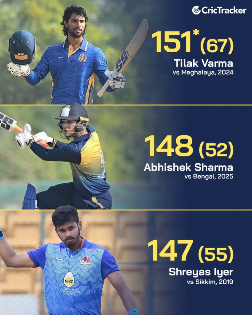 इससे ऊपर सिर्फ Tilak Verma का 151 रन वाला knock ही है, जो उन्होंने 2024 में Meghalaya के खिलाफ बनाया था।